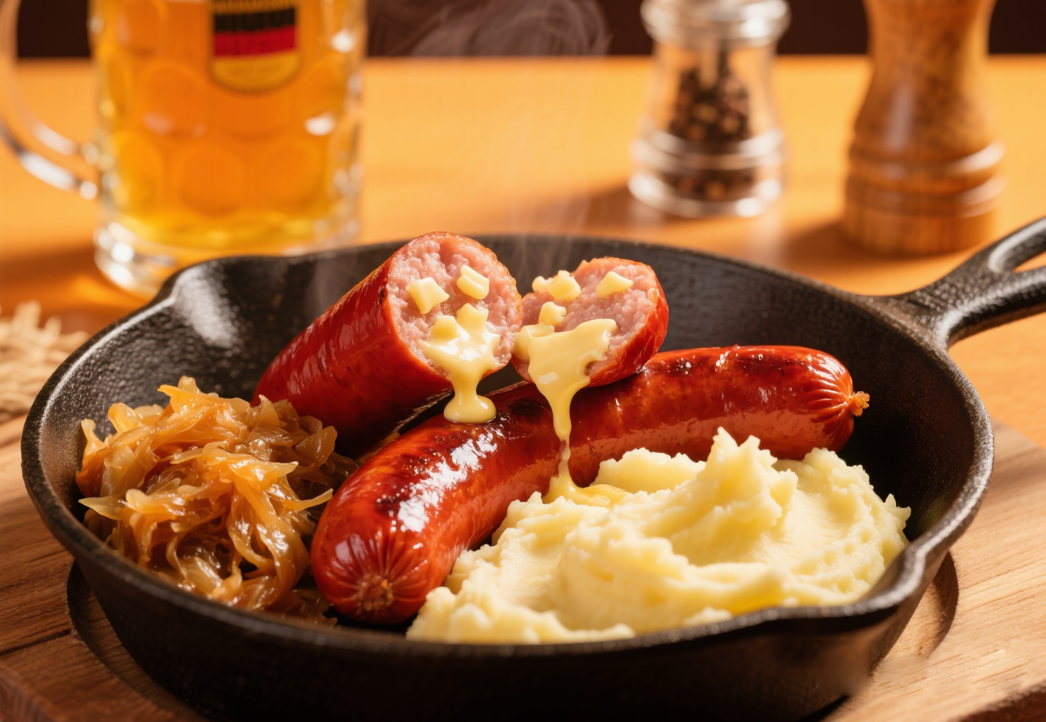 特點:通過煎制形成酥脆腸衣,內(nèi)部奶酪熔化成流心狀態(tài),搭配德式酸菜解膩,還原地道巴伐利亞風味。